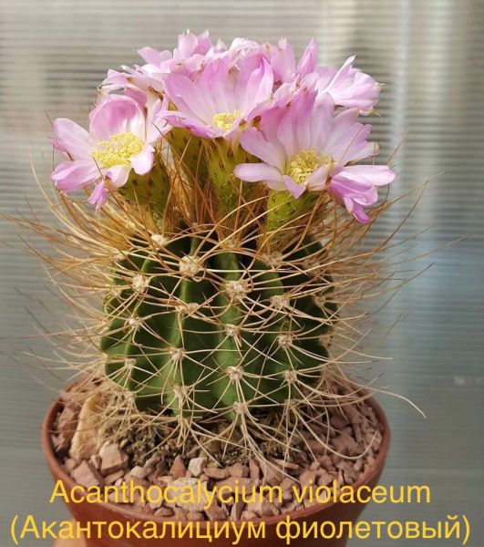 Acanthocalycium violaceum имеет длинные, изгибающиеся, желтовато-коричневые колючки, которые появляются из сердцевинок весной и летом. У него сиреневые цветки (необычная окраска для кактуса), у других разновидностей — белые, розовые, оранжево-красные или желтые.