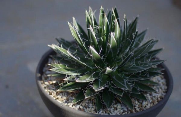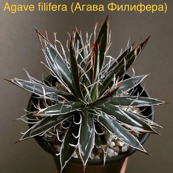 Агава нитчатая отличается тонкими листовыми пластинами (до 2-4 сантиметров). Их длина – до 30 сантиметров. Оттенок – оригинальный матово-зеленый, по краям имеет белое окаймление. Формирует розетки рыхлого типа. На кончике каждого листика имеется колючка коричневого окраса, со временем она становится серого оттенка. Отличительная черта вида – по краям листьев имеются сухие волокна.