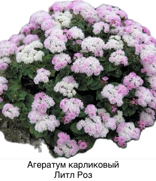 Уникальная карликовая форма агератума, формирующего кустики шаровидной формы, усыпанные нежно-розовыми звездчатыми соцветиями.