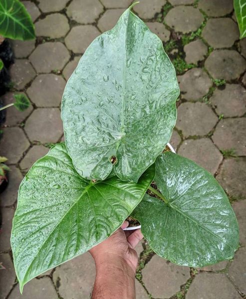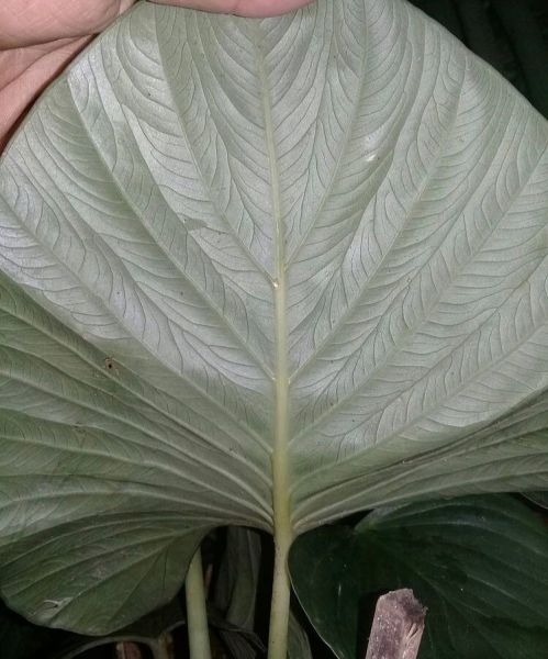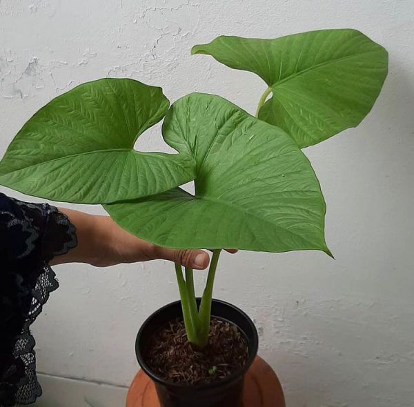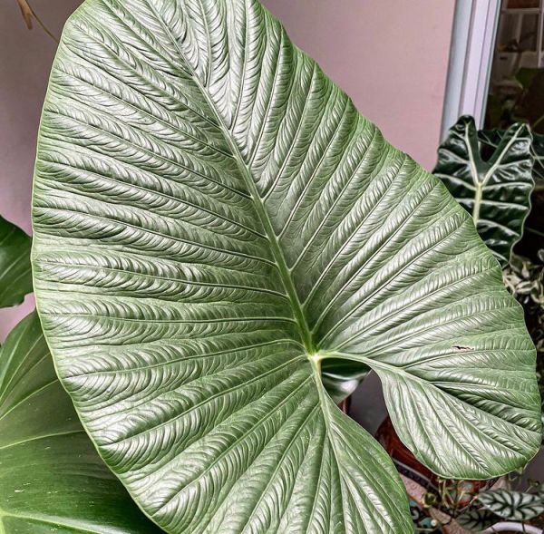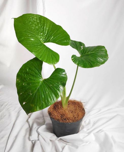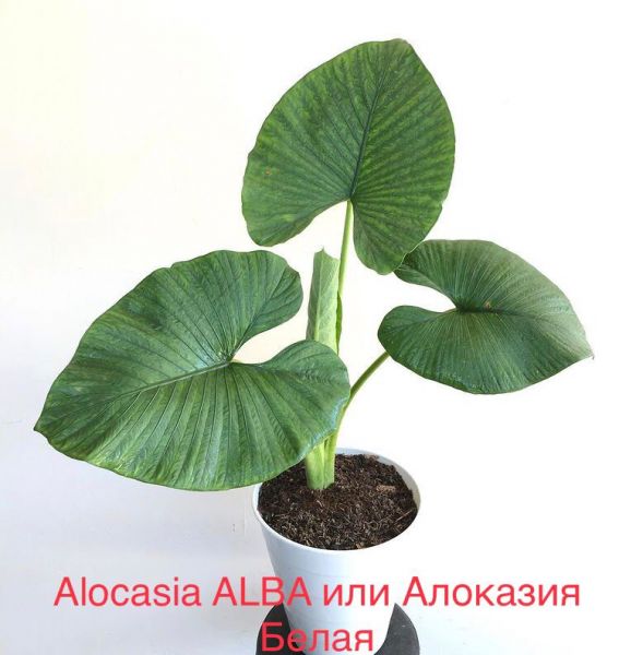 Alocasia ALBA или Алоказия Белая - невысокий многолетник 1-1,5 м высотой. Черешки длинные, немного желобчатые. Листья сердцевидные с глубокой выемкой в основании, толстые, гофрированные с выступающими жилками с нижней стороны. Алоказия – экзотическое тропическое растение, многие виды которой отличаются друг от друга высотой, формой, размерами, окраской листьев. В качестве комнатного цветка алоказия пользуется большой популярностью. Её выращивают в домашних условиях как великолепное лиственно-декоративное растение. Она прекрасно вписывается в любой дизайн интерьера, служит украшением зимних садов. В качестве комнатного цветка алоказия отлично смотрится на верандах, в светлых фойе, возле искусственных фонтанов и водоёмов. Принадлежит семейству Ароидные. Представители рода вырастают в высоту от 40 см, некоторые вытягиваются до 2 м и более, то есть имеют как компактные, небольшие размеры, так и гигантские древовидные формы. В большинстве случаев вечнозелёные, изредка с опадающими на зиму листьями. Отличается необычной формой цветков и плодов. На срезах растения выделяется прозрачного вида жидкость, которую называют млечным соком.
