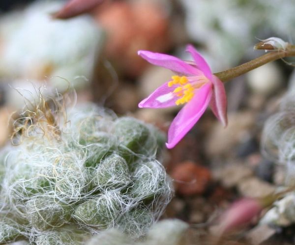 Стебли до 5 см высоты, с реповидно утолщенными корнями, плотно расположенными удлиненно- овальными листьями и белыми длинными волосками. Цветки розовые, 3 см в диаметре. Родина - Южная Африка.