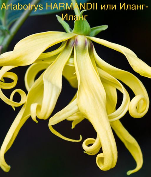 Artabotrys HARMANDII или Иланг-Иланг, Лазающий Иланг-Иланг, Парфюмерное дерево, Артаботрис Душистый - очень интересная тропическая лиана или кустарник, цветущий ароматными цветами. Родина юго-восточная Азия. Листья узко эллиптические 6-15 см длиной и 2-4 см шириной. Цветы слегка поникающие от светло-зеленого до канареечно-желтого цвета. Аромат цветов очень сильный, сладковато-фруктовый, опьяняющий. После цветения образуются плоды 3-4 см в диаметре, желтые при созревании. Глубокий и богатый запах цветков Иланг-Иланга напоминает жасмин и нероли. Эфирное масло Иланг-Иланга широко используют в парфюмерии для создания восточной и цветочной композиции, в ароматерапии, в косметике, в кулинарии. В основе всемирно известных духов Chanel № 5 лежит экстракт Иланг-Иланга.