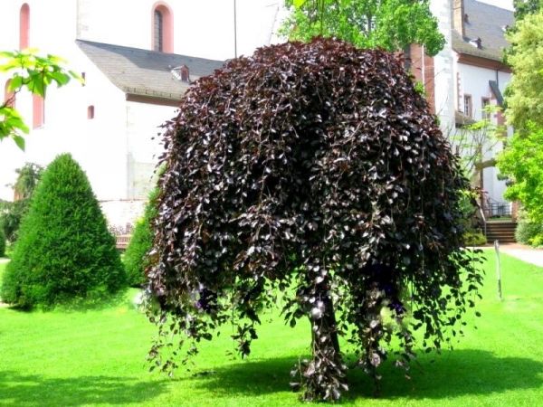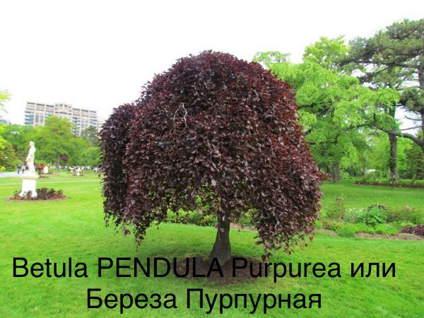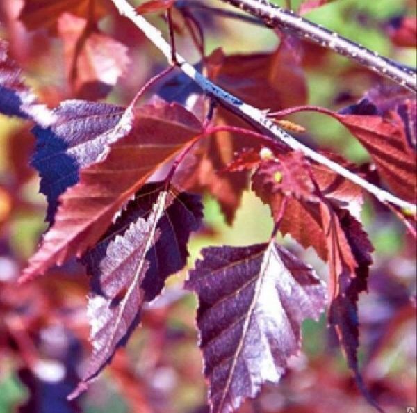Береза Повислая Пурпурная - это Узкое, медленнорастущее дерево с бородавчатыми веточками и темно-серо-черной корой. Особенно эффектны у нее ромбовидные, необыкновенной яркой окраски листья. Рано весной, распускающиеся листочки имеют очень яркий и выделяющийся на фоне нежно- зеленой листвы других деревьев темно-красный цвет, летом они становятся темно-пурпурными, а осенью перекрашиваются в коричнево-красный. Поэтому эта березка очень эффектно смотрится на фоне зданий или растений с контрастной окраской, как в одиночных посадках, так в составе сложных древесно-кустарниковых композиций. Фитонциды березы прекрасно стимулируют дыхательную систему. Пахучие вещества молодых листочков снимают перенапряжение нервной системы. Цветёт в апреле-июне. Плодоносит — в июле-сентябре.