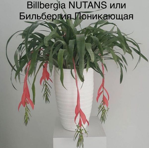 Billbergia NUTANS или Бильбергия Поникающая – это эпифитное эффектное растение, образует вытянутую розетку из многочисленных узких листьев. Листья линейной формы, утонченные на конце, до 60-70 см длиной и около 1-2 см шириной, с шипами по краю. Листья зеленого цвета, при более интенсивном освещении приобретают красноватый или бронзовый оттенок. Тонкий длинный цветонос, поникающий, с присоцветными розовыми листьями. Цветет зимой.