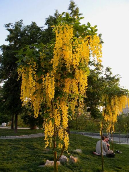 Настоящий золотой дождь начинается с середины мая по июнь, поэтому весенние заморозки ему не страшны. Цветы ярко-желтого (золотистого) цвета, собранные в многоцветковые соцветия. В длину могут достигать до 30 - 40см.