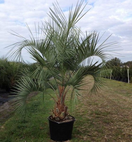 В современном цветоводстве комнатные пальмы пользуются популярностью — они необычны, красивы и очень экстравагантны. Особое внимание привлекает бутия. Листья дуговидные, черешки длинные. Длина листовых пластин в среднем достигает 3 м. На каждой из них находится около 90 пар долей в виде меча, узких и продолговатых. Их длина составляет примерно 74 см. Они зеленые, слегка сизоватые, на обратной стороне более светлые. На молодых экземплярах у листьев есть опушение, у взрослых — становится колючками. По мере роста нижние листочки отмирают и отпадают, а на их месте остаются коротенькие пеньки от черешков, так формируется необычный внешний вид ствола. Цветет пальма весной красивыми светло-красными цветочками, которые превращаются в душистые, съедобные плоды. Их используют для приготовления наливок и варенья, а также в свежем виде. Размножается только семенами. Сначала их на сутки опускают в теплую воду для набухания, накалывают, затем высевают поверхностно, не заглубляя, накрывают пленкой и ставят на свет. Всходы появляются через 3-6 месяцев, но в отдельных случаях прорастание семян затягивается до 2-х лет. После появления первого листочка, растения рассаживают в отдельные горшочки. Любит регулярный и обильный полив, без застоя воды, а также опрыскивание утром и вечером, слабокислую почву и хороший дренажный слой на дне горшка. Подкормку проводят в период интенсивного роста 1 раз в 2 недели. Плохо реагирует на пересадку. С марта по август поддерживают температуру +19-24оС. Осенью и зимой, в период покоя, снижают температуру до 14оС. Бутия отличается внушительными размерами, поэтому размещают в просторном, хорошо освещенном помещении. Летом можно вынести на балкон.