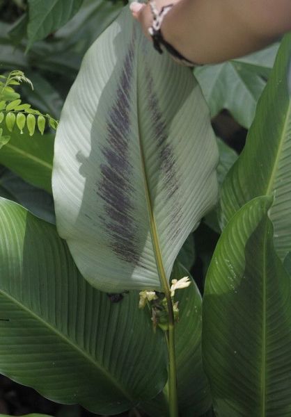 Цветонос 1-2 м высотой; корни крупные клубнеподобные. Черешки с короткой волосистой оболочкой, несколько буроватые; лопасти от яйцевидных до продолговато-яйцевидных, туповатые до коротко заостренных, около 70 см длиной и 30 см шириной, двухцветные, часто со светло-фиолетовыми полосами между серединой и краем, поверхность голая, плиссированная; Калатея (лат. Calathea) — декоративное комнатное растение семейства марантовых. Калатея достаточно популярна у цветоводов благодаря своей необычной и оригинальной расцветке. Её округлые листья пестрят невероятными узорами из полос и пятен различных оттенков зелёного и бурого цветов.