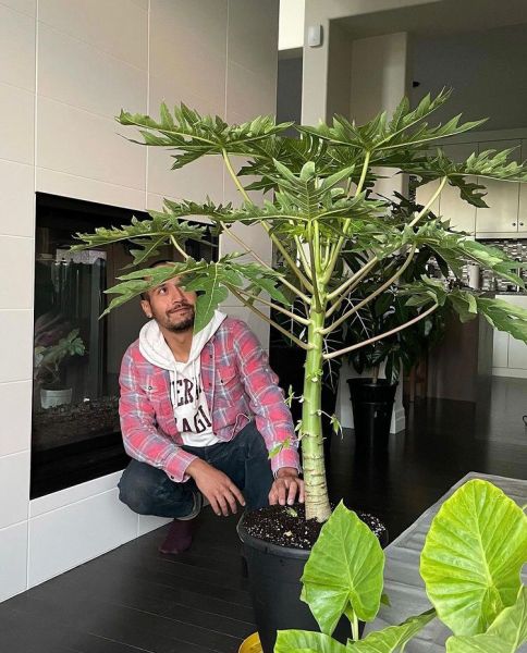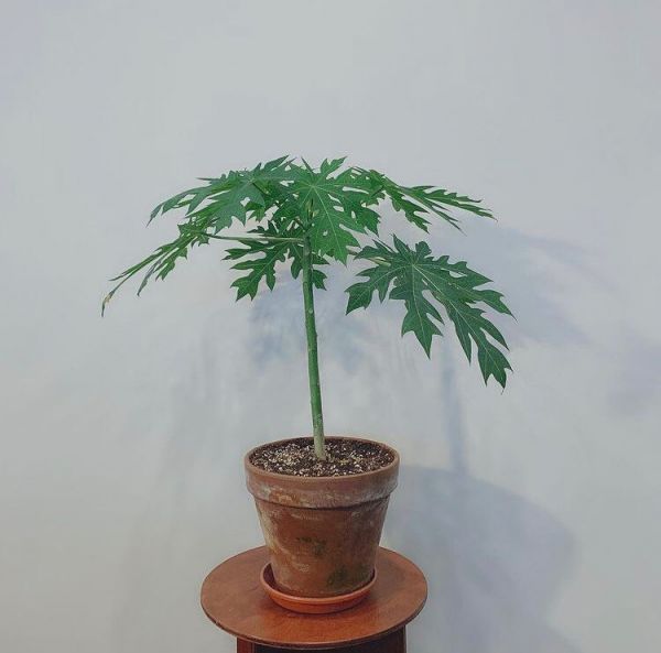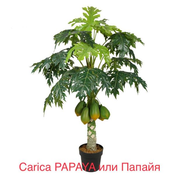 Carica PAPAYA или Дынное дерево, Папайя - тропическое растение из семейства Кариковые, его высота зависит от емкости контейнера и колеблется от 1 м до 2,5 м. Крупные, растущие по спирали листья живут 4-6 месяцев, затем опадают, и папайя становится похожей на пальму, с зонтиком листьев на верхушке ствола.