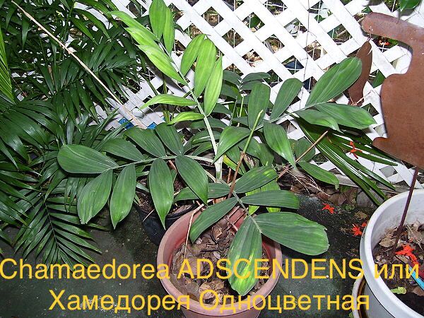 Chamaedorea ADSCENDENS или Хамедорея Одноцветная - компактная пальма с единственным вертикальным стволом. Растение достигает в высоту 2,5 м. Листья перистые, зелёные, выгнутые, на длинных черешках, цветение отмечено бледно-желтыми махровыми шариками. Принадлежит семейству Пальмовые.