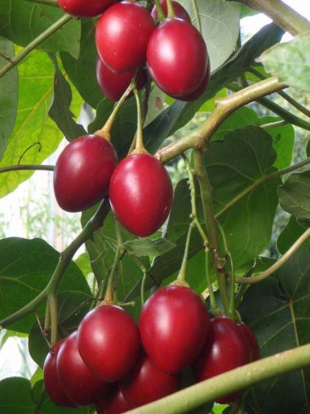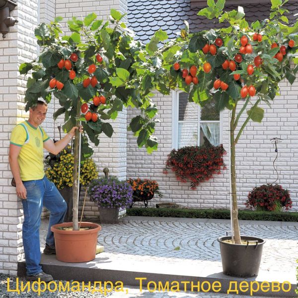 Цифомандра, тамарилло, помидорное дерево — вечнозеленое древовидное субтропическое растение из семейства паслёновых высотой до 4 м. В средней полосе России выращивается в комнатной культуре, на юге может расти в открытом грунте, так как выдерживает кратковременные заморозки до -4 градусов. Ствол цифомандры очень крепкий, ширина кроны до 1,5 м в поперечнике. Листья очередные, крупные, сердцевидной формы, слегка опушенные, 10 см длиной и 4-8 см шириной, со своеобразным пасленовым ароматом, не слишком приятным, за что его не любят грызуны. Соцветие — внепазушный завиток. Цветки по виду напоминающие картофельные, собраны в крупные соцветия от 30 до 50 цветов. Плод - сливовидная двухкамерная ягода с плотной кожицей. В зрелом виде в зависимости от сорта могут иметь разнообразную окраску: от темно-пурпурного и кроваво-красного до оранжево-красного и кремово-желтого цвета. Плоды по вкусу напоминают смесь томата, земляники и киви одновременно. Цифомандра требовательна к поливу и освещению (при недостатке освещения растения загнивают, хотя устойчиво к болезням). Почва не должна пересыхать, иначе листья опадут. Нежелательно и переувлажнение; если растение заливать, оно погибнет. Цифомандру размножают семенами. Оптимальная температура для прорастания семян 25°С. Всходы при такой температуре появляются через 15-20 дней. Сначала сеянцы растут очень медленно. Интенсивный рост их начинается через 1,5-2 месяца, и к концу первого года вегетации они достигают высоты 1 м. Каждые 3 месяца размер горшка увеличивают на 2-3 л. Тамарилло советуют употреблять тем, кто страдает частыми мигренями. Из него можно готовить как овощные, так и блюда, которые традиционно готовят из фруктов. Но перед этим плод необходимо обязательно очистить от кожицы, которая своим неприятным вкусом может испортить любое блюдо. Если есть тамарилло в сыром виде, то следует разрезать его пополам и ложечкой извлечь мякоть, не затрагивая при этом кожицу. Плоды употребляют в пищу как в сыром виде, так и после кулинарной обработки (вареные), кроме того, их консервируют. Плоды томатного дерева почти не хранятся и не выдерживают длительных перевозок. Свежие плоды можно хранить в холодильнике в течение недели. Недозрелые доходят при комнатной температуре за два-три дня.