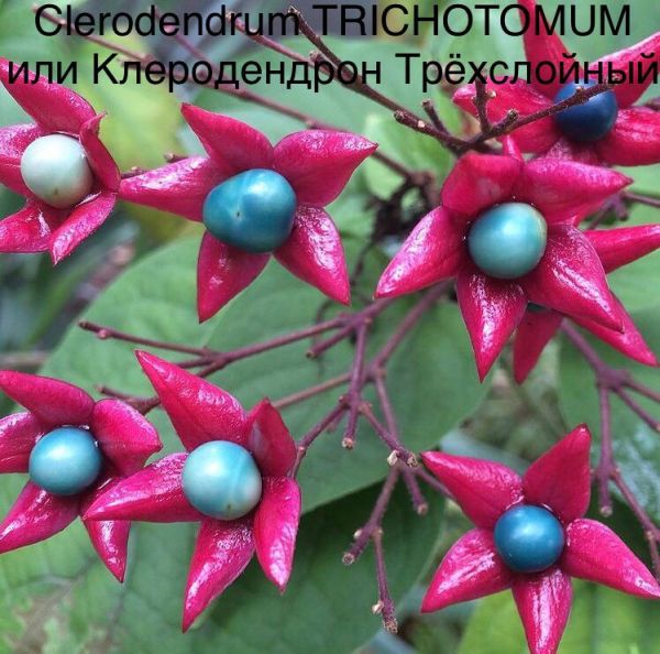 Редкий вид. Clerodendrum TRICHOTOMUM или Клеродендрон трёхслойный - невысокое листопадное экзотическое дерево с необычно красивым оригинальным цветением и плодоношением. Cемейство вербеновые - Verbenaceae. Родина - Китай, Япония. Clerodendrum trichotomum может достигать 3,5 м и более в высоту. Прямой ветвистый ствол со светло-серой корой и округлой кроной. Листья овальные, молодые - лиловые, далее темно-зеленые до 15 см длиной.