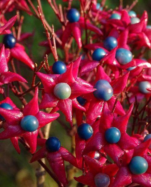 В августе собранные в кисти розоватые бутоны раскрываются в звездчатые белые цветки. После опадания венчика остается красная чашечка, возможны вариации цвета, в серединке которой образуется бирюзово-голубой плод - костянка.