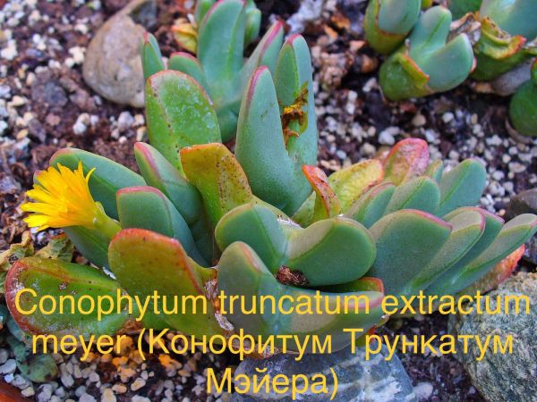 У Конофитумов вся надземная часть образуется посредством тесного срастания двух мясистых листочков, принимающих сердцевидную, сферическую или яйцевидную форму, могут иметь вид усеченного конуса со скругленными гранями или шарика с бугристой поверхностью. Эти мелкие листья в виде сочной головки и они отчетливо двулопастные. В диаметре могут измеряться 0,3 см, но двулопастная головка в поперечнике измеряется в пределах 1,25–2,5 см. Стебель имеет маленький размер, и он тщательно скрыт субстратом. Окрас этих суккулентов может варьироваться от зеленых и голубых оттенков до бурых тонов, иногда стебли крыты пятнистостью или крапчатостью. Бывает, что кромка лопастей окрашена в красноватый тон. Именно из-за этого окраса конофитум редко можно отличит в естественной среде от лежащих рядом камешков.