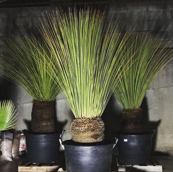 Dasylirion LONGISSIMUM или Дазилирион Длиннейший, Мексиканская трава - очень красивое и выносливое растение семейства Спаржевые. Ствол короткий. Листья плоские, вытянутые, серебристо-зеленые или голубовато-зеленые, по краю пильчато-зубчатые, на конце заостренные, формируют круглый кустарник. Пышная, шаровидная розетка дазилириона состоит из узких, длинных листьев, количество которых колеблется от 100 до 300. Цветки многочисленные, колокольчатые, белые, зеленовато-белые, желтые, коричневато-желтые, сидят на длинных цветоносах, которые выходят из центра розетки.