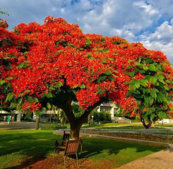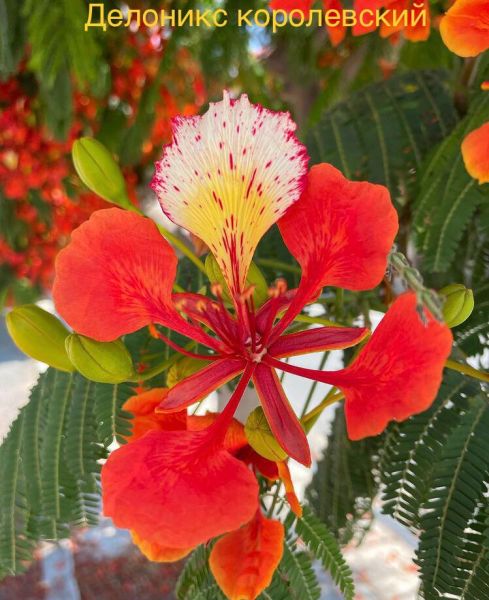 Это полувечнозеленое дерево вырастает до 10 м, напоминает своей раскидистой кроной широкий зонт. Элегантные ярко-зеленые, дваждыперистые листья длиной 30-50 см складываются на ночь. В нашей зоне делоникс выращивается как комнатное растение. Весной и в начале лета дерево покрывается крупными ярко-красными цветами, около 10 см в диаметре, собранными в большие кисти. Цветы по красоте могут соперничать с орхидеями, состоят из четырех красных лепестков с «ножкой» и одного более крупного вертикального лепестка с желтыми и белыми пятнами. Пылающие драгоценными цветами деревья представляют собой восхитительное зрелище, продолжающееся в течение 1-2 месяцев. Позже образуются одревесневшие плоские стручки длиной до 60 см, содержащие крупные семена. Делоникс предпочитает прямое солнце, равномерное тепло и влажность. Почва должна быть рыхлой и легкой, ей необходим хороший дренаж. Неприхотлив к качеству грунта и  может хорошо развиваться в широком диапазоне рН. Семена делоникca имеют очень твердую оболочку, которую перед замачиванием в воде скарифицируют либо размягчают (обдав кипящей водой или кислотой), затем замачивают в течении 1-2 суток в теплой воде, а затем  перед высадкой в грунт оболочку удаляют. Жизнеспособные и правильно обработанные семена обычно прорастают через 1-2 недели, в противном случае прорастание может затянуться.
