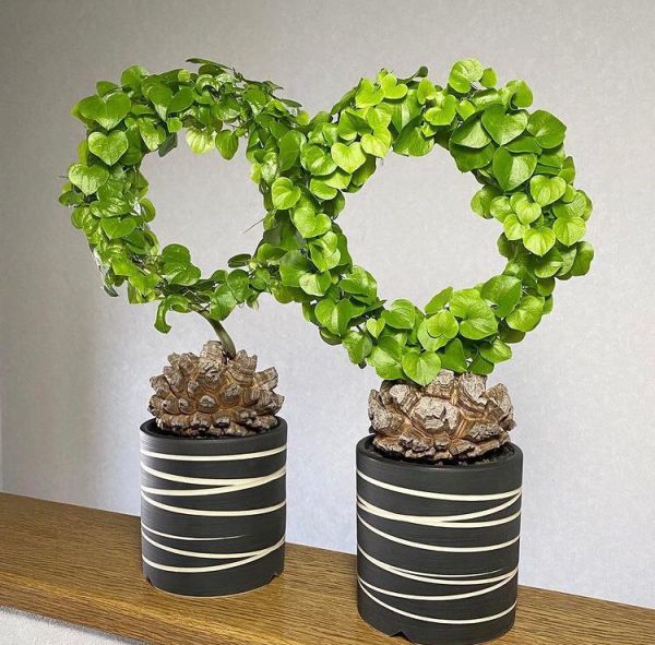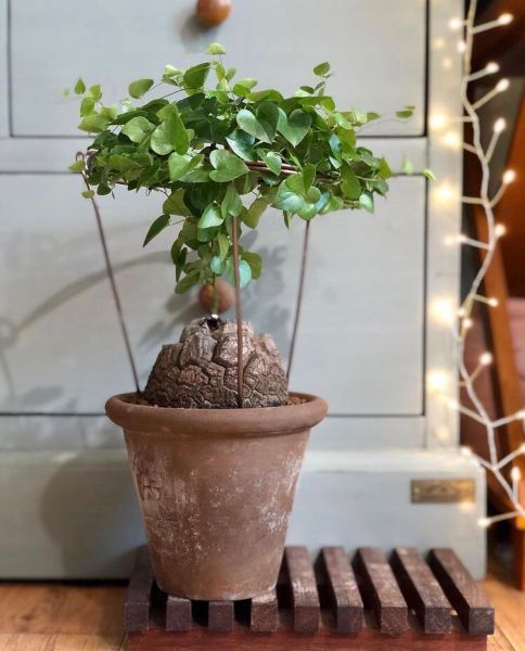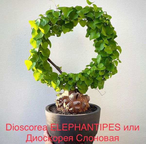 Dioscorea ELEPHANTIPES, Диоскорея Слоновая или «Слоновая нога» – одно из самых популярных каудексных растений, которое выращивают цветоводы по всему миру, принадлежит семейству Диоскорейные. Образует надземный клубень похожий, из-за покрывающих его многоугольных пробковых бляшек, на панцирь черепахи. Из него отрастают нежные побеги со стреловидными зелеными листьями. Растущим стеблям необходима опора, поскольку без нее они поникают, закрывая тем самым эффектный клубень.