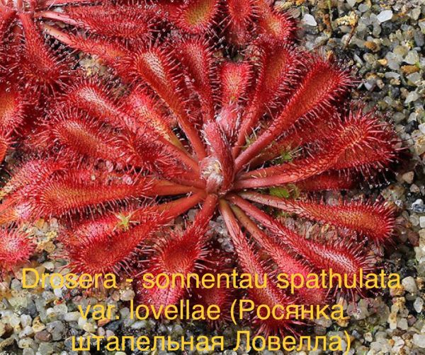 Росянка штапельная Ловелла - форма её листиков более вытянутая, окончание листиков не напоминает ложку. Её новые листики немного приподняты над уровнем субстрата. Росянка Drosera spatulata var. lovellae чуточку больше сорта Drosera spatulata. Она укрыта росистыми усиками, которые окрашиваются в более интенсивый красный цвет. Цветы у этой росянки белого цвета.