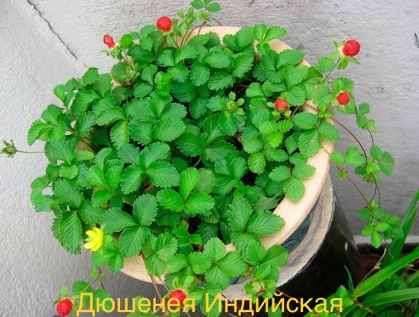 Почвопокровный многолетник около 10 см высотой, очень похожий на землянику: розетки тройчатых листочков дают обильные "усы", которые образуют красивый, непроницаемый для сорняков ковёр и после укоренения не нуждаются в поливе. Весь сезон с весны до поздней осени дюшенея покрыта одновременно ярко-жёлтыми одиночными цветками и изящными, идеально круглыми, смотрящими вверх красными ягодами в окружении зелёных чашелистиков на прочных цветоносах. Сочетание ярких зеленых листьев, жёлтых цветков и красных ягод с сильно выступающими, расположенными в геометрическом порядке семенами создаёт удивительно праздничное настроение. Дюшенея индийская очень неприхотлива: она успешно растёт на любой почве, устойчива к вытаптыванию и засухе, не страдает от ярких солнечных лучей, хорошо зимует. Дюшенея идеально подходит для выращивания на альпийской горке, хорошо смотрится на подпорной стенке и в подвесной корзине со свисающими вниз "усами". Для выращивания в качестве комнатной культуры посейте семена дюшенеи в плошку с дренажом и накройте посевы стеклом. Обычно через 2-3 недели появляются всходы, а через месяц сеянцы дюшенеи достигают в высоту 3-5 см. Красиво, когда в одном горшке располагается сразу несколько растений.