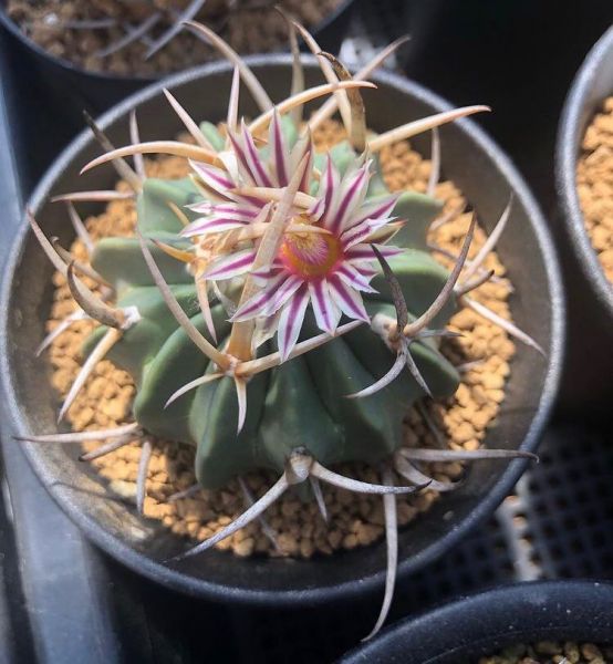 Ребра от десяти до четырнадцати. Ареолы снежно-белые, сильно опушенные. Колючки от трех до пяти штук, до пяти сантиметров длиной, кремово-белые (красные когда молодые). Цветки розово-пурпурные, в длину три сантиметра, диаметр два сантиметра. За этим кактусом легко ухаживать, и поэтому он подходит для начинающих коллекционеров.