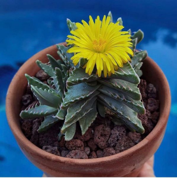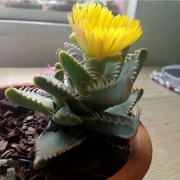 Небольших размеров суккулент, выглядит впечатляюще: маленькие толстые листья, напоминающие пасти хищника, полные острых клыков, словно защищают нежное цветение.