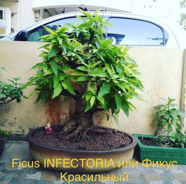 Ficus INFECTORIA или Фикус Красильный, Фикус Инфектория - субтропический вид, с большими красивыми зелеными листьями. Можно отнести как к листопадным, так и вечно зеленым деревьям. Отличается особенностью дважды в год обновлять листву. Это происходит осенью и в начале лета. На концах ветвей появляются молодые листочки, когда старые листья, ещё не опали. Поэтому, растение выглядит декоративно, практически, круглый год. Может выращиваться карликовым деревцем в горшке и в стиле бонсай.