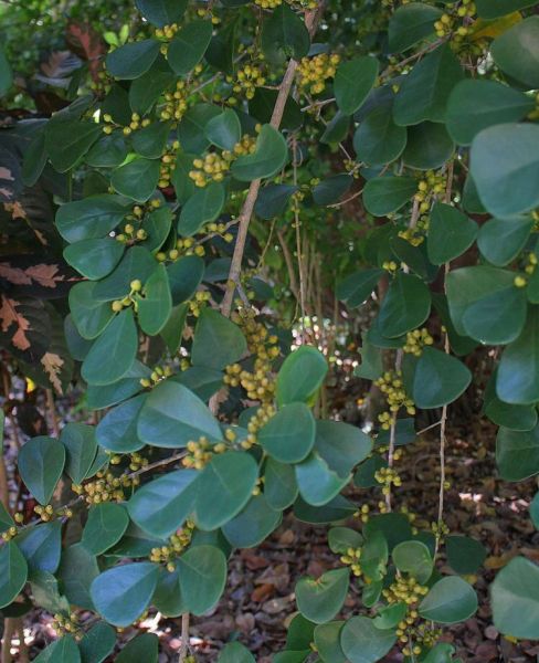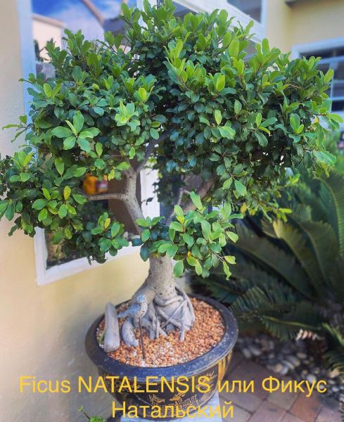 Ficus NATALENSIS или Фикус Натальский - эпифитный кустарник или крупное, вечнозеленое дерево 30 м высотой. Листья противоположные, кожистые, глянцевые, темно-зеленые со светлой средней жилкой, обратнояйцевидные, лопатовидные. Плоды мелкие, одиночные или в парах, круглые, зеленовато-желтые с красными бочками.