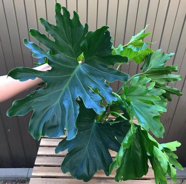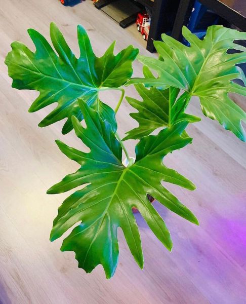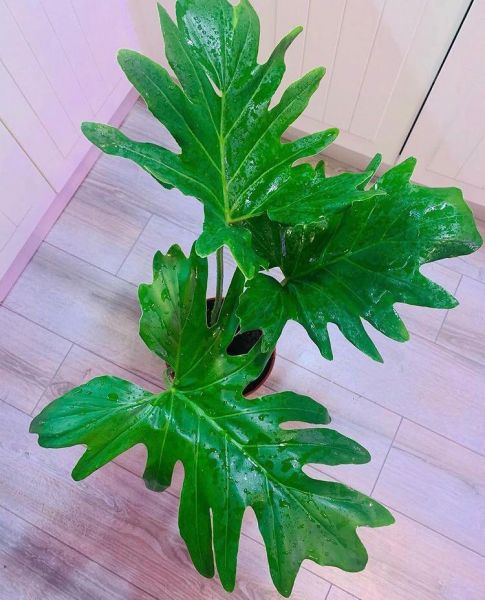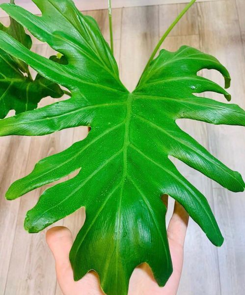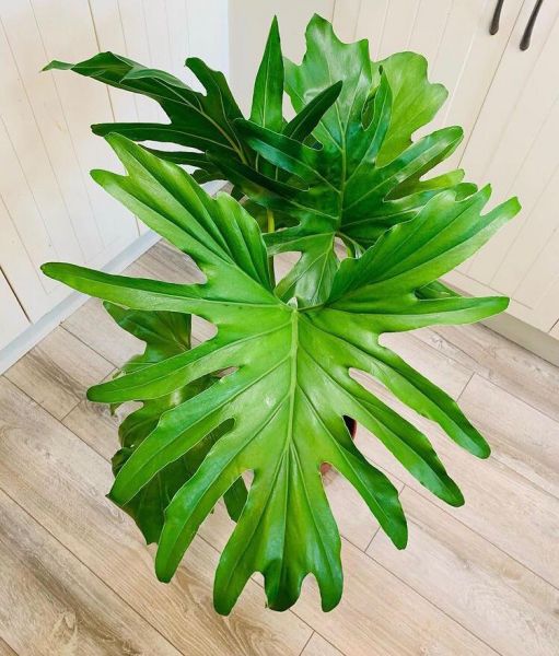 Крупное декоративно-лиственное растение прекрасное украшение для холла и гостиной. В домашних условиях достигает высоты 1,5 м. Листья на длинных прочных черешках длиной 40-90 см. Листовая пластинка у взрослых листьев глянцевая кожистая, сердцевидная, длиной до 90 см и шириной до 70 см, глубоко рассеченная на доли, с неровными, как бы кудрявыми краями. В оранжерейной культуре цветет, при искусственном опылении плодоносит.