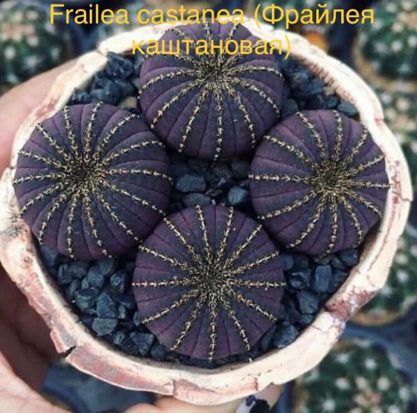 Фрайлея каштановая имеет стебель шаровидной формы, коричнево-зеленого цвета с боковыми побегами. Растение небольшого размера, диаметром не более 4 см. Ребра отделены друг от друга четко выраженными полосками, плоские и достаточно широкие. Колючки очень маленькие, мягкие и плотно прилегают к поверхности кактуса. Цвет колючек может быть от коричневого с красным до черного, количество — от восьми до одиннадцати штук. Цветки небольшие, имеют форму конуса.