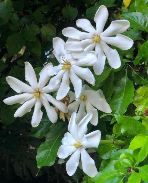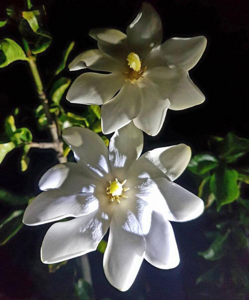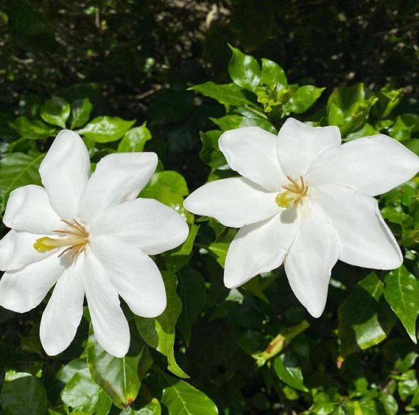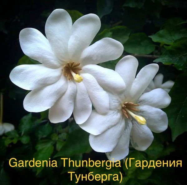 Красивый вечнозеленый цветущий куст или маленькое дерево с гладким прямым главным стеблем и короткими ветвями. Листья светло-зеленые, глянцевые, с выступающими прожилками. Цветы крупные (7,5см в диаметре), эффектные, сливочно-белые, очень ароматные (особенно ночью).