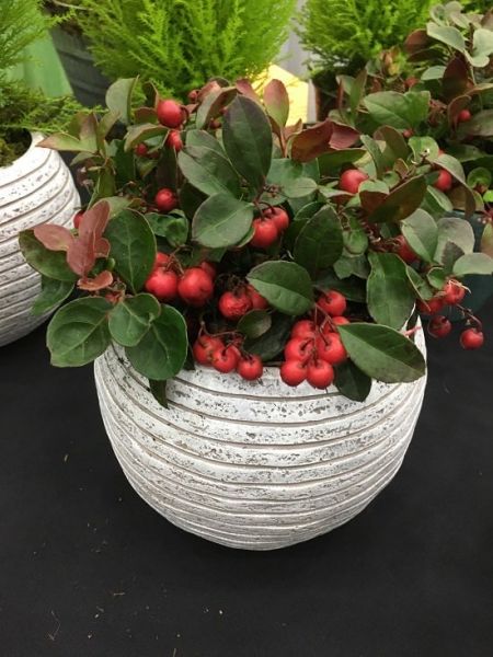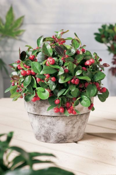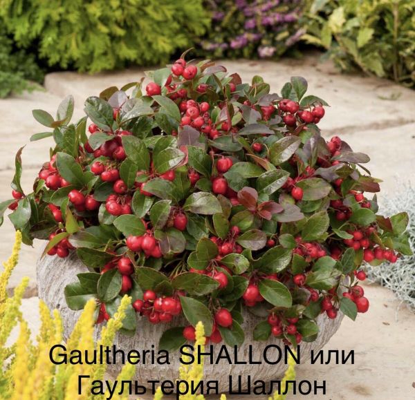 Gaultheria SHALLON или Гаультерия Шаллон -очень эффектный низкорослый кустарник семейство вересковых. Родина - Гималаи, Восточная Азия, Австралия, Северная и Южная Америка. Вечнозелёный кустарник, редко достигающий высоты более 60 см. В мае-начале июня он покрывается белыми или розовыми цветками, похожими на ландыши, на смену которым появляются красивые, различной окраски, округлые плоды. Форма листьев варьируется от яйцевидной до узкой, почти игловидной, напоминая короткие листочки тиса. Многие цветоводы культивируют из-за привлекательного наряда: сочетание окраски листьев и плодов необыкновенно эффектно и к тому же очень долго держится на растении, невзирая на погоду. Весьма популярна Гаультерия в ландшафтном дизайне и активно используется в альпинариях. Чтобы появились плоды, посадите рядом мужское и женское растения. Может выращиваться и как горшечная культура. Плоды не съедобны. Быстро разрастается, заполняя всё свободное пространство. Чтобы не разрасталась, следует вовремя удалять корневые отпрыски. Может выращиваться в качестве подлеска под высокими деревьями. Гаультерия Шаллона хорошо зимует в условиях средней полосы, выдерживая понижение до -20ºС.