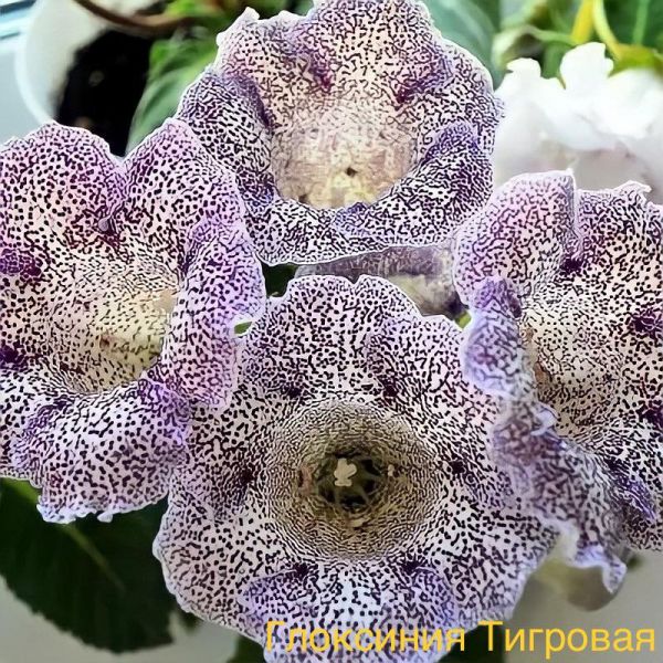 Глоксиния Тигровая  – изящный сорт с прелестными колокольчатыми цветами пестрой окраски. Диаметр цветов от 8 до 10 см. Клубневый многолетник высотой до 25 см. Семена в гранулах, посев значительно облегчается. Растения из семян зацветают в текущем сезоне, к осени формируется клубень.