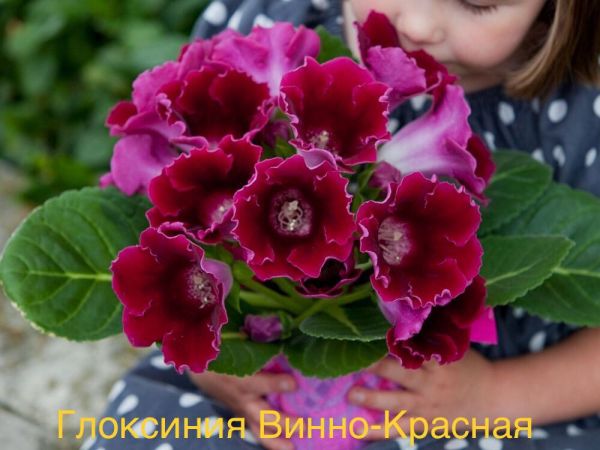 Роскошное и очень модное среди цветоводов комнатное растение из семейства Геснериевые. Самая рано зацветающая серия среди немахровых глоксиний. Цветки колокольчатой формы, винно-красные, с приятной бархатистой поверхностью венчают длинные цветоносы. Широкоовальные листья на коротких черешках украшают основание цветоноса. На взрослом растении образуется 10-15 крупных цветков, создавая впечатление нарядного букета. Глоксиния предпочитает светлые, солнечные места без воздействия прямых солнечных лучей. Идеальная температура для роста — 20°С - 25°С днем и 18°С - 22°С ночью. Во время цветения необходим обильный полив, еженедельные подкормки, влажный воздух (опрыскивание из пульверизатора). В октябре-ноябре. после цветения, полив и подкормку прекращает. Когда листья глоксинии засохнут, клубни вынимают из почвы и помещают на хранение в неглубокие ящички с чуть влажным песком или перлитом, которые устанавливают в помещении с температурой 10-12°С. После периода покоя (примерно 90 дней) клубни дадут новые ростки и их снова можно будет пересаживать в горшок. Семена на рассаду высевают поверх субстрата (не заделывая в почву с февраля по март, накрывают стеклом и ставят в теплое, светлое место. Всходы появляются при температуре 22-24°С, через 10-14 дней В фазе 3-х листьев растения пикируют, через месяц рассаживают в отдельные горшки. Зацветает глоксиния выращенная из семян через 9-10 месяцев.