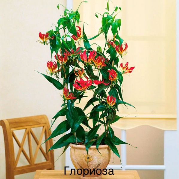 Многолетняя экзотическая цветущая лиана из семейства Лилиейные. В комнатных условиях вырастает до 1,4 м и более. Нежные, изящные стебли нуждаются в опоре. Листья очередные, продолговато-ланцетовидные, оканчиваются неразветвленным нитевидным усиком. Эффектные крупные цветки распускаются в середине лета. Лепестки с волнистыми краями, у основания околоцветника окрашены в зеленый тон постепенно перходящий в желтый, оранжевый и ярко-алый. Глориоза теплолюбивое растение, предпочитает солнечные места с притенением в полуденные часы. В период интенсивного роста ее обильно поливают и опрыскивают листья. После цветения полив постепенно уменьшают, а когда листья засыхают — прекращают полностью. Клубень хранят в горшке при температуре 10-12°C. Весной пересаживают. Размножают клубнями и семенами. Семена высевают в феврале в плошки с почвенным субстратом из листовой земли и торфа. Накрывают стеклом (проветривают раз в день) и поддерживают температуру около 22 -24°C. Цветение наступает через 2-3 года.