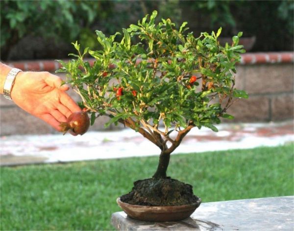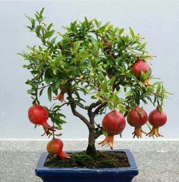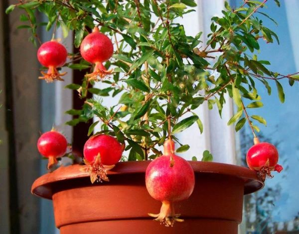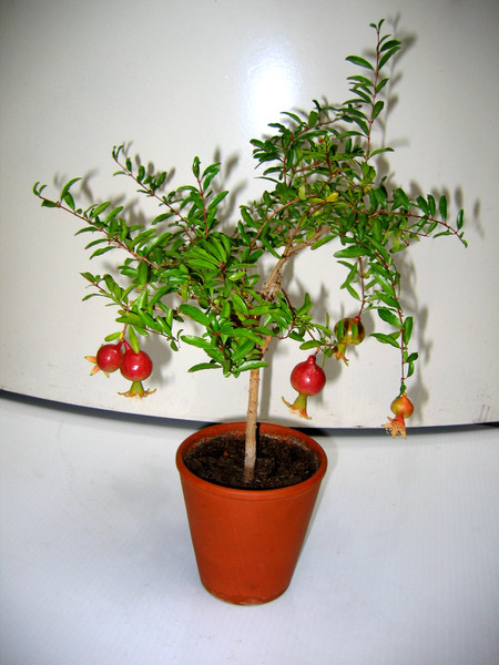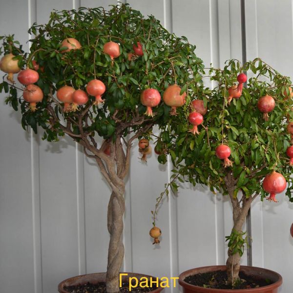 Гранат — листопадный субропический кустарник. Растение неприхотливое, высотой до 60-100 см, с небольшими изумрудными эллиптическими листями. Цветет с мая по август красными цветками до 2,5-4 см в диаметре. Плоды диаметром до 5-7 см имеют многочисленные семена, окруженные сочной облолочкой. Сок приятный, кисло-сладкий. Предпочитает прямое солнце на окнах южной, юго-западной и западной экспозиции (летом желательно притенение), опрыскивания, регулярный полив водой комнатной температуры. При чрезмерном поливе могут растрескиваться плоды. По окончании весенних заморозков растение можно вынести в сад в полутень до осени. Зимой гранат сбрасывает листья. В этом состоянии его поливают очень редко и содержат при температуре 5-10 °C. Почвосмесь должна быть рыхлой и питательной (1ч. дерновая, 0,5 ч. перегнойная, 1 ч. листовая земля, 1ч.песок). Весной с начала роста побегов и до июля растение подкармливают еженедельно цветочным удобрением. В конце периода покоя гранат каждые 2 года пересаживают в более крупный сосуд. Семенами размножается довольно легко при обычной комнатной температуре. Их высевают на глубину 0,5 см. При температуре 25 °C всходы появляются через 2-6 недель. Молодые сеянцы для лучшего ветвления многократно прищипывают. В начале лета делают санитарную обрезку, удаляя слабые и направленные внутрь ветви. Ему можно придать любую форму кроны, в. т.ч. бонсай. Гранат обладает лекарственными свойствами: общеукреплящим, противодиарейным, жаропонижающим и др.