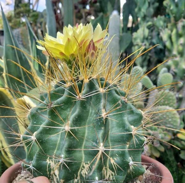 Любопытно, что пока хаматокактус еще молодой, то колючки красиво оттеняют зеленую поверхность эпидермиса стебля желто-красным колером, но со временем, старея, растение становится обладателем сероватых колючек. На это стоит обращать внимание при выборе кактуса в цветочном магазине. Всех Hamatocactus отличает то, что в верхней части ареол имеется железка, которая в процессе вегетационной активности кактуса начинает выделять сладковатый нектар.