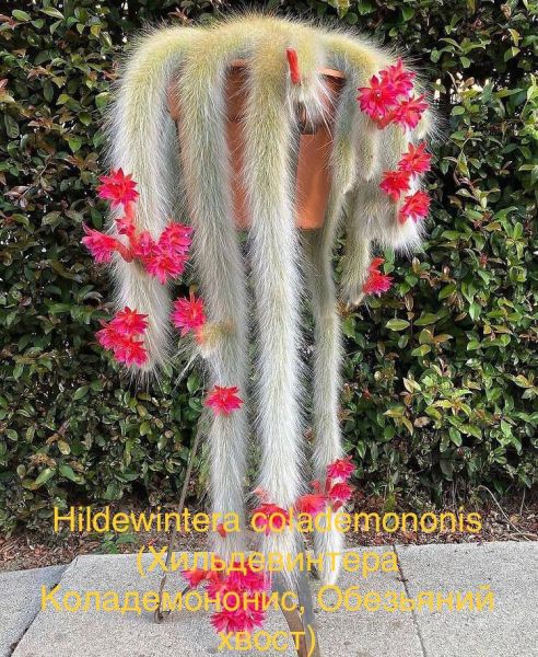 Хильдевинтера Коладемононис имеет зелёные, повисающие стебли длиной до 1м, очень тонкие, всего 2,5 см в диаметре, густо опушенные золотисто-желтыми щитинковидными колючками. Центральная игла не выражена. Крупные великолепные ярко оранжевые или оранжево-розовые цветы (7 см длиной и 5 см в диаметре) живописно контрастируют с золотистой окраской опушения. Цветение продолжается в течении нескольких дней. Другая странность этого растения, благодаря которой, собственно, род и получил своё название - особенность цветка. Будучи трубчатым по своей форме, покрытый многочисленными чешуйками, он у большинства растений не раскрывается (это явление называют клейстогамией), становясь похожим на длинную тонкую яркую шишку, а семена внутри цветка завязываются в результате самоопыления.