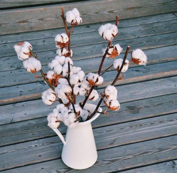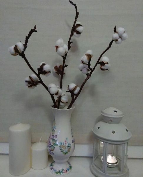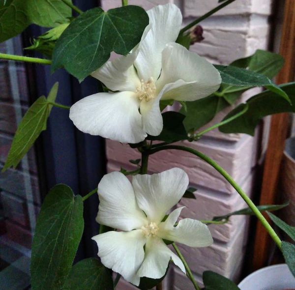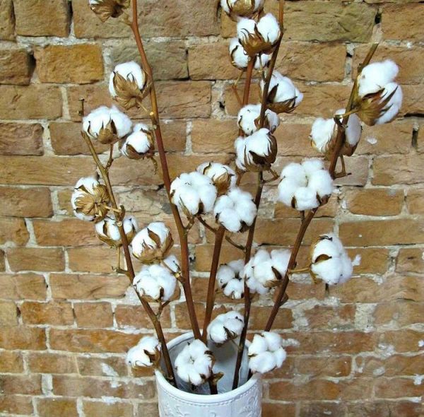 Интересное растение из семейства Мальвовые, прямостоячее, ветвистое, формирует хорошо развитый куст. Листья крупные, пальчато-лопастные, очередные, черешковые. Цветет крупными нежно-желтыми цветками, на месте которых образуются плоды-коробочки. При их растрескивании появляется масса белоопушенных семян. Растение очень теплолюбивое, засухоустойчивое, но чтобы иметь здоровые, хорошо развитые экземпляры его выращивают при достаточной влажности и хорошем проветривании. Предпочитает светлые и солнечные места. Семена легко прорастают, при раннем посеве, начиная с января-февраля, растения досвечивают. Посевы и молодые растения выдерживают при температуре 20°С. Когда сеянцы подрастут, их закаляют и помещают в хорошо проветриваемое место. Хлопчатник предпочитает богатые гумусом субстраты. Ему необходим регулярный полив. Влажность воздуха для растения необходима, ее поддерживают в течение всего лета опрыскиванием. Это мероприятие защищает растение от поражения клещом. Подкормку производят еженедельно, крупных растений - 2 раза в неделю, поливая цветочным удобрением. По мере роста растения переваливают в более крупные горшки.
