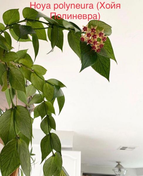 Hoya polyneura – кустарниковая хойя, выращивают чаще в подвесных горшках. Листья гладкие, темно-зеленые, 10 см длиной, 5.5 см шириной, с заметным жилкованием. В зонтике открывается до 10 цветков диаметром 1,8 см. Бледно-розовый венчик цветка слегка отогнут назад, корона цветом спелой вишни.