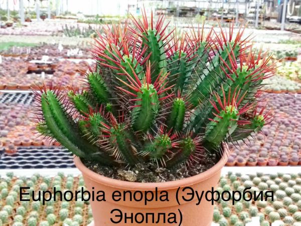 Эуфорбия Энопла - замечательный суккулентный вид Молочая, обладающий эффектными красно-фиолетовыми шипами, длинной до 6 см. Шипы обильно покрывают все растение. При этом само растение обычно достигает 30–50 см в высоту. Этот похожий на кактус вид ветвится от основания и имеет окрас от светло-зеленого до голубовато-зеленого. Стебли и ветви ребристые. Количество ребер от 6 до 8. Листья крошечные, редуцированные. Интересный факт — колючки этого Молочая образованы из видоизмененных стерильных цветоносов. Цветки двух типов, женские и мужские. Они плотные, желтого цвета, на длинных и толстых цветоносах. Во время цветения напоминают вытянувшиеся глаза улитки, что придает растению особенную декоративность.
