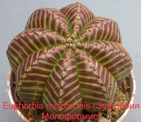 Эуфорбия Мелоформис - один из самых экзотических видов суккулентных Молочаев, похож на кактус. Представляет из себя многолетнее растение высотой и диаметром около 10 см. Ствол округлый или удлиненно округлый, с 8 или 10 ребрами. Иногда встречаются разветвлённые от основания формы. Цвет зеленоватый или сизоватый. Имеет эффектные светло-зеленые или пурпурно-коричневые поперечные полосы. Ребра тупые и широкие с небольшими бугорками. Листья редуцированы до чешуек.