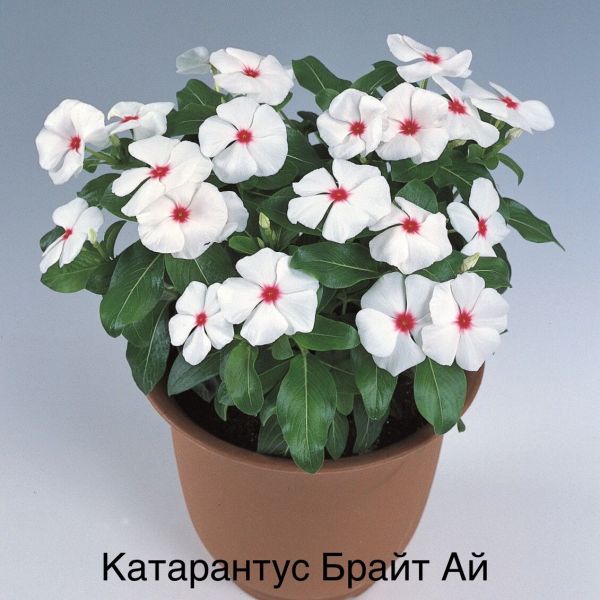 Комнатное растение с темно-зелеными листьями и крупными (до 5 см в диаметре) яркими цветками, очень похожими на цветки барвинка. Катарантус можно выращивать как однолетник. Куст компактный рано начинает ветвиться, предпочитает теплое, солнечное, защищенное от холодных ветров местоположение. Земляную смесь готовят из равных частей дерновой и листовой земли, перегноя, торфа и песка. Семена высевают в конце зимы и ранней весной, присыпая небольшим слоем земли. Посев необходимо прикрыть темной пленкой, поскольку для прорастания катарантусу требуется полная темнота. Всходы появляются через 7-10 дней, при температуре 24-27°С. Сеянцы пикируют в стадии 2-х настоящих листочков в горшочки. В дальнейшем молодые растения пересаживают в горшки или высаживают весной в открытый грунт, когда минует угроза заморозков. Цветение у катарантуса начинается через 4-6 месяцев после появления всходов. Катарантус будет великолепным украшением комнат, балконов и лоджий, а также прекрасно подойдет для оформления цветников, для создания невысоких бордюров, так как очень засухоустойчив и прекрасно переносит жару.
