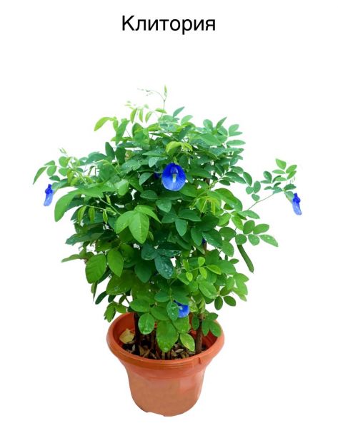 Одно из самых красивых и удивительных тропических растений-лиан. Быстрый рост и ранние сроки цветения клитории позволяют формировать эффектные ампели для украшения помещений и летних веранд. При раннем прищипывании побегов растение легко формируется и приобретает компактную форму кустика. Листья перистые, состоят из 5-7 листочков. Цветки ярко-синие, размером 5×2-4 см, по форме напоминают бабочек с широко распахнутыми крыльями. Цветение с мая по сентябрь. Бобы длинные, до 4-13 см. Для успешного роста клитории необходим питательный рыхлый грунт, хороший дренаж и умеренная температура. Зимой ее содержат при температуре около +10... 12°C и умеренном поливе. Летом поддерживают яркое солнечное освещение или легкую полутень, не допуская полного затенения растения, т.к. в этом случае клитория может не зацвести. Подкормки проводят с весны до осени комплексным минеральным удобрением для цветущих растений.