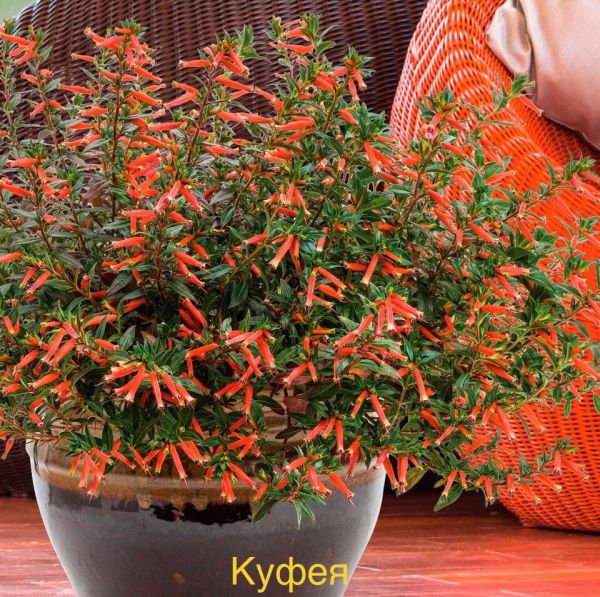 Стелющееся, кустистое растение до 30 см в высоту. Выращивается как комнатное растение или как однолетнее в открытом грунте. Цветки различных оттенков, одиночные, до 3 см длиной, расположены по всей длине стебля. Посев на рассаду в марте-апреле в ящики. Семена слегка вдавливают в почву, землей не присыпают. Посадочную емкость накрывают стеклом и ставят в освещенное теплое место. При температуре почвы +18-22°C всходы появляются на 10-15 день. Рассаду высаживают в мае после окончания весенних заморозков в горшки или балконные ящики. Расстояние между растениями 30 - 35 см. Цветение с конца июня до заморозков. Возможен прямой посев в мае непосредственно в открытый грунт. В таком случае цветение начнется с августа и до наступления заморозков. Все куфеи светолюбивы, засухоустойчивы и очень теплолюбивы. Поливы важны после высадки рассады и в сухую погоду. Подкормки обеспечивают обильное цветение. Великолепно смотрится в подвесной корзине, где размещают 2-3 растения для большей декоративности. Можно использовать в бордюрах.