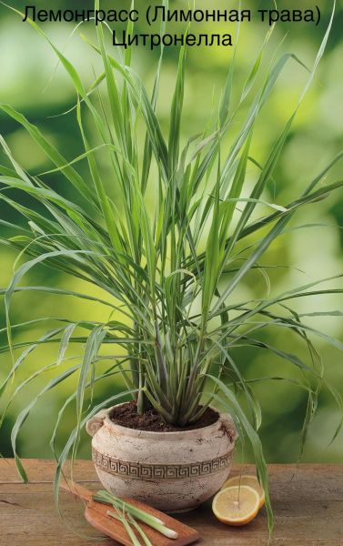 Лемонграсс (Лимонная трава) Цитронелла - выращивается как многолетнее комнатное растение, или как однолетнее в открытом грунте. Листья и стебли растения обладают цитрусовым ароматом и вкусом. Используют в качестве комнатного дезодоранта и защиты от насекомых. Растение любит влагу, но не переносит застоя воды. Располагать цветочный горшок с цитронеллой лучше на кухне, где выше влажность воздуха, на теплом солнечном подоконнике. Предпочитает рыхлую, плодородную почву с хорошим дренажем. Посев на рассаду — во второй половине марта в хорошо увлажненный грунт на глубину 0,5 см. Укрыть пленкой или стеклом. После появления всходов пленку убирают. Уход за растением — в поливах, рыхлении почвы. Листья и стебли срезают по мере надобности, сушат или хранят в холодильнике в пластиковой пленке или герметичных емкостях.