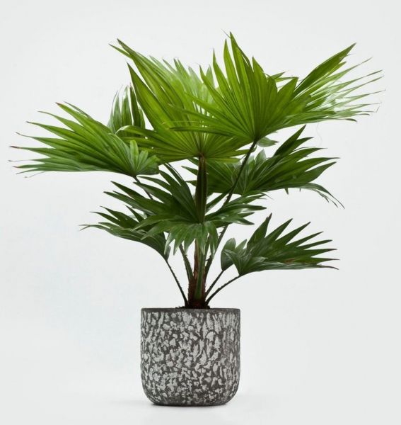 Тропическое растение из семейства Пальмовые. В природе ливистона — это высокое дерево с колоннообразным стволом и крупными, веерными листьями. В комнатных условиях эта пальма практически не образует ствола, медленно растет, достигая максимальной высоты 1,5-2 м, не цветет. Очень декоративна благодаря веерным, ярко-зеленым листьям с изящно загнутыми на концах пластинками на длинных черешках. Растение раздается в ширину и требут значительного пространства. Предпочитает освещенные места, без воздействия прямых солнечных лучей. Для ливистонии важно проводить регулярное опрыскивание листьев, иначе они подсыхают. Летом пальму желательно выносить на свежий воздух и обильно поливать водой, зимой — устанавливать в светлых, прохладных помещениях, сокращая полив, но не допуская пересыхания кома. Размножают растения семенами, или боковыми отростками. При семенном размножении предварительно замоченные семена сажают на глубину 1 см с почву из смеси дерновой, листовой, перегнойной земли и крупного речного песка и накрывают стеклом или полиэтиленом. Регулярно проветривают. Всходы появляются в течении 3-х месяцев. Окрепшие сеянцы высаживают в отдельные горшки. Пересадку по мере необходимости производят весной в свежую почвосмесь. Украсит интерьер комнат, офисов, учреждений, прекрасно дополнит композиции зимнего сада.