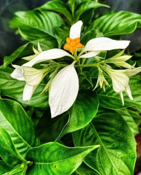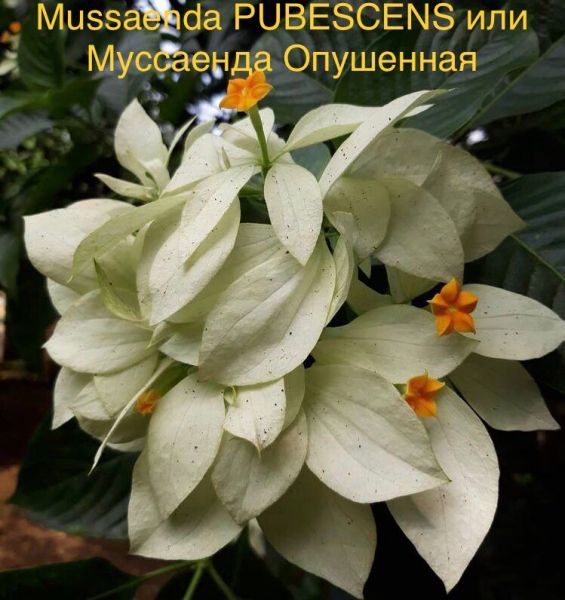 Mussaenda PUBESCENS или Муссаенда Опушенная - многолетние, вечнозеленые, тропические кустарники или полукустарники семейства Мареновые, распространенные в тропиках Азии и Африки. В дикой природе растение может представлять собой кустарник, а может и достигать в высоту более 3 метров и напоминать небольшое дерево, в комнатной культуре составляет обычно от 60 до 100 см. Листья эллиптические или яйцевидные, располагаются супротивно, зеленые, длиной 15 — 18 см. Нижняя поверхность листьев часто имеет опушение. Цветки небольшие, с 5 продолговатыми лепестками, воронковидные, собраны в соцветия – кисти на верхушках побегов. Основную привлекательность муссенде придают яркие прицветники длиной до 7,5 см, красного, белого, желтого, оранжевого или розового цвета. Растение имеет довольно продолжительный период цветения – с начала июля до конца октября, однако при правильном уходе и благоприятных условиях произрастания оно может цвести практически круглый год. После опыления на растении начинают формироваться плоды – мелкие, круглые или эллиптические, пурпурные, красновато-коричневые или черные, сочные ягоды (реже сухие многосемянные коробочки), с миниатюрными семенами внутри. При комнатном выращивании растение практически не плодоносит.