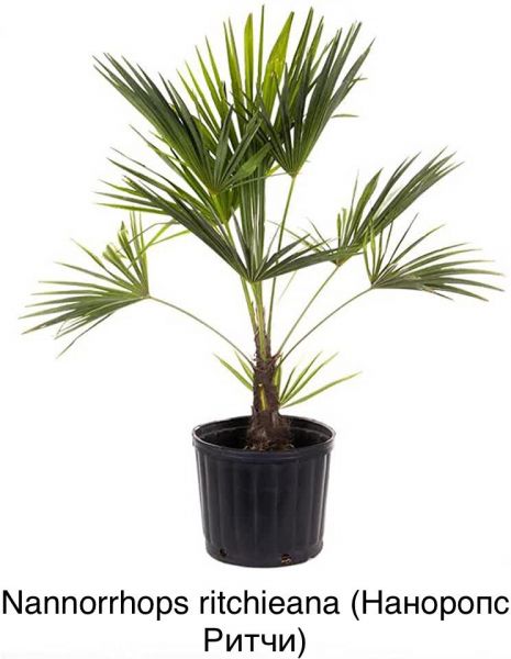 Наноропс Ритчи - очень редкая, вечнозеленая, морозо и засухо- устойчивая пальма. Не образует надземного ствола, ветви развиваются прямо над землей от основания пальмы. Растет большим раскидистым кустом, с большими, жесткими, веерными, зелено-голубыми листьями. Период декоративности круглый год. Цветет во взрослом состоянии и только один раз, после чего, растение образует съедобные плоды с одним семенем, отмирает, возобновляя свой рост от прикорневой поросли. Этот вид может быть рекомендован для высадки в открытый грунт, для озеленения приусадебных участков и садов. Будет неповторимым элементом экзотики для большинства участков средней полосы.
