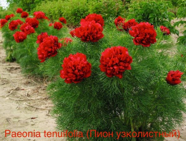 Характерной особенностью Пиона узколистного является то, что он покрыт относительно узкими листьями большой длины. Наряду с привлекательным внешним видом, узколистный пион отличается необыкновенным ароматом. Узкая листва окрашена в яркие зеленые тона. Даже осенью они долго не сменяются желтой расцветкой. Бутоны средней величины – до 0,1 м. Для них характерна сочная ярко-красная расцветка. Большое количество нежно-золотистых пыльников тоже смотрится привлекательно. Цвести тонколистный пион начинает с конца мая. Продолжительность цветения — 10 суток, причем на каждый куст приходится свыше 10 бутонов.