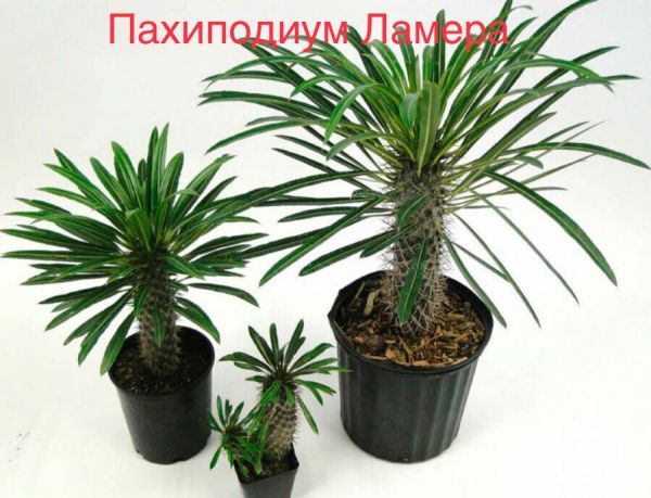 Это необычное растение - суккулент с Мадагаскара. В комнатных условиях достигает высоты 1 м. В процессе роста формирует одревесневающий, прямостоячий, редко-ветвящийся, слегка утолщенный в нижней части стебель, покрытый немного выступающими, расположенными по спирали бугорками, на каждом из которых обычно по 3 мощные колючки. На верхушке стебля формируется плотная розетка темно-зеленых листьев, со светлой главной прожилкой. Листья удлиненно-ланцетные, 15-30 см длиной и 4-9 см шириной. На зиму часть листьев опадает. Цветки кремово-белые или с легким розовым оттенком. Внимание! Сок растения весьма ядовит, поэтому соблюдайте осторожность при работе с ним, и ни в коем случае не размещайте Пахиподиум в детской комнате.