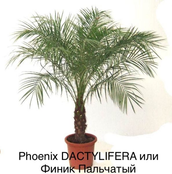Phoenix DACTYLIFERA или Финик Пальчатый, Финиковая пальма - это благороднейший представитель тропической флоры и вместе с тем один из самых изящных и самых величественных лиственных растений комнатного сада. Это стройное вечнозеленое дерево, родом из влажных районов Африки, принадлежит семейству Арековые (Аrесасеае). Финик пальчатый — дерево с прямым стволом, покрытым остатками листовых черешков. Деревья достигают высоты 15—26 метров (изредка 30 м).